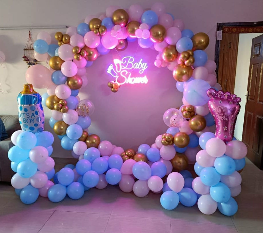- Balloon arch of 250 balloons (Pink, Blue and Gold chrome color)
