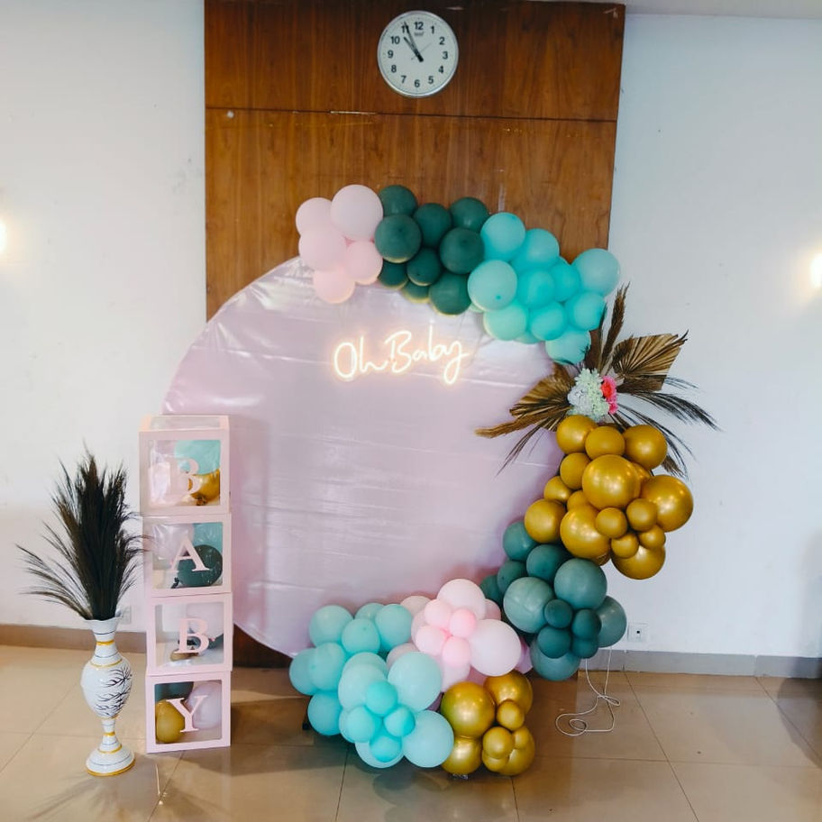 - Balloon arch of 200 balloons (Pastel pink, Parrot green, Navy blue and Gold chrome color)