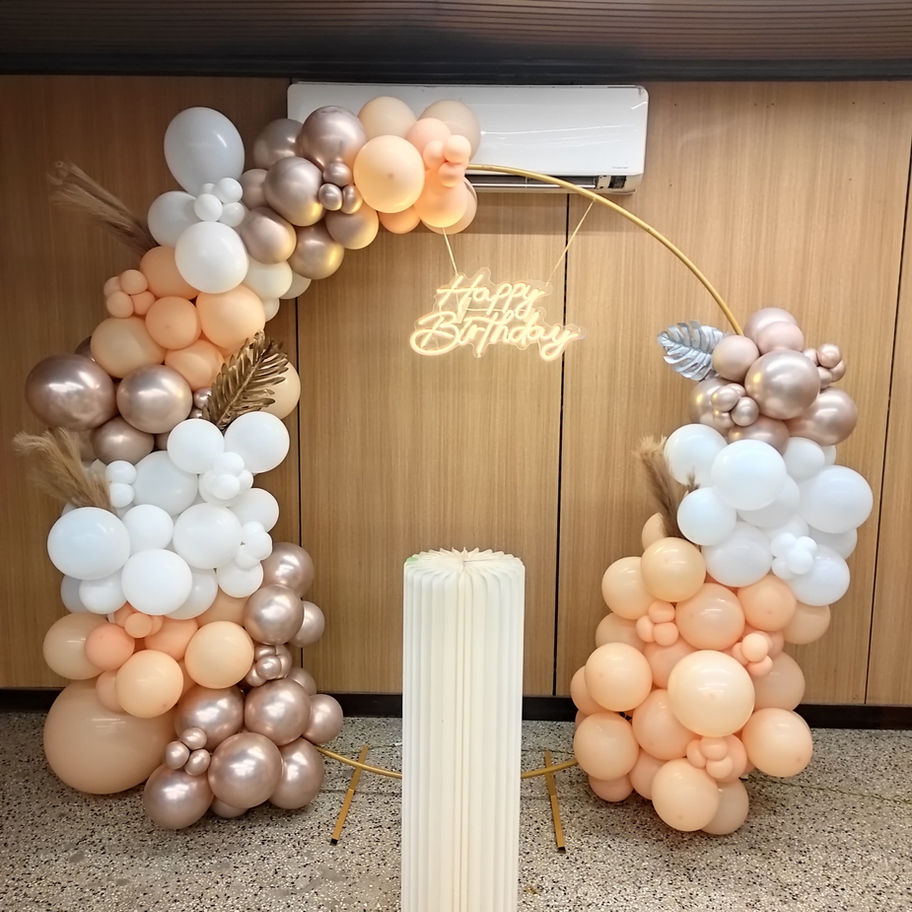 - Balloon arch of 250 balloons (White, Rose gold chrome and peach color)
