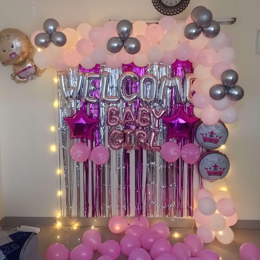 - Arch of 100 balloons of color 50 pastel pink and 50 white latex and decorated with 12 silver chrome balloons